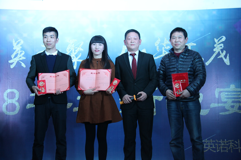 ▲五周年特別貢獻(xiàn)獎 由董事長程總頒發(fā)證書及獎金 授予榮譽人員:陳斌、林水英、程琥(從左至右排序)